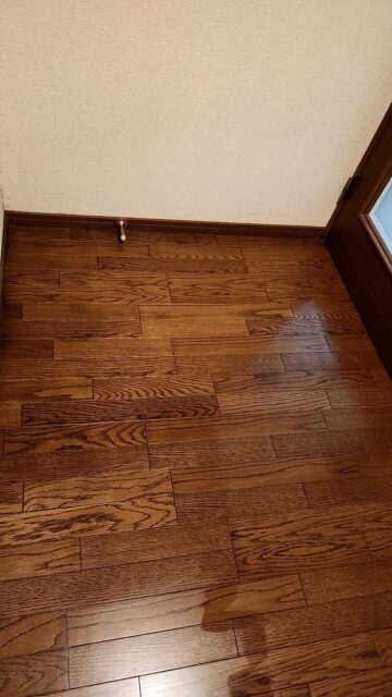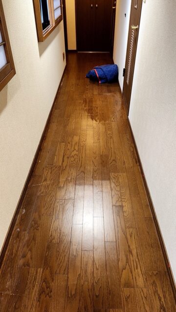 幸いにもお客様は怪我もされず無事だったのですが、水がついてしまった廊下は無事とはいかず、ところどころ床が浮いてしまったり塗装が剥がれてしまったりしてました。